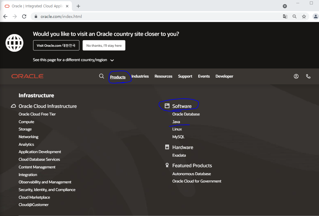 www.oracle.com 접속하여 Product - Software에 있는 Java를 클릭