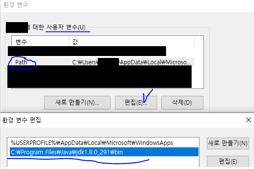 JAVA_HOME 시스템 변수를 만들었으면 사용자변수에서 Path 변수를 추가하기위해 편집한다.