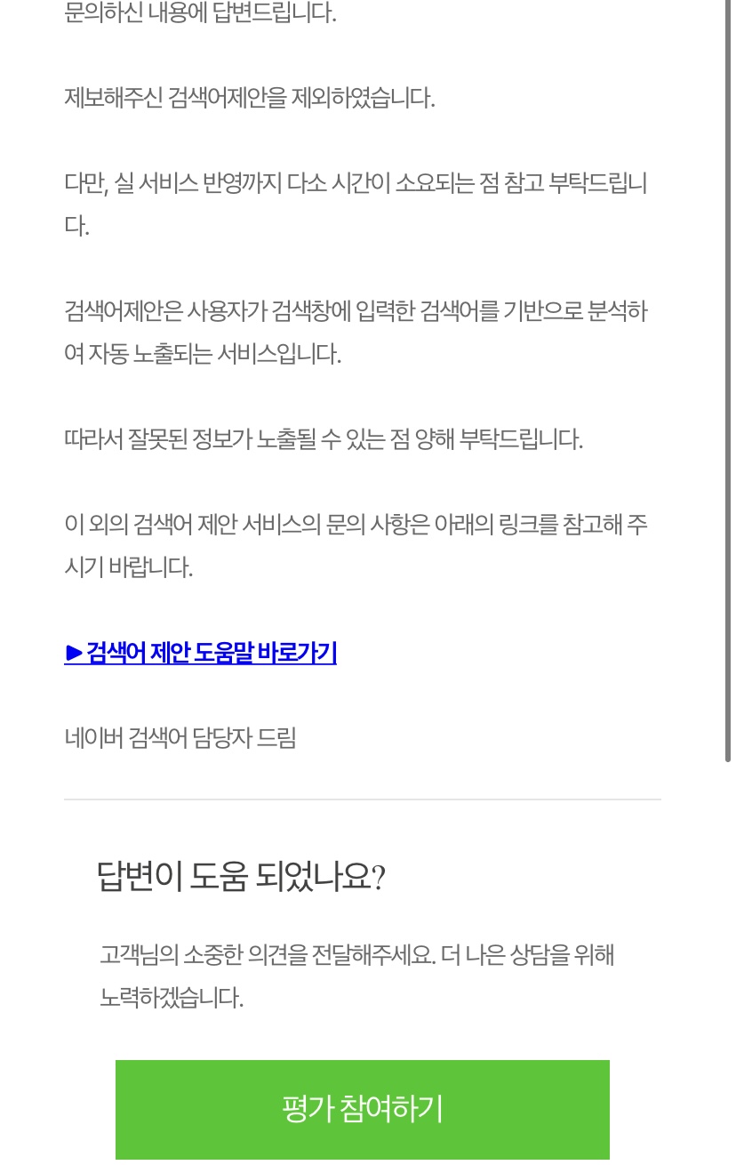 내가 제외 요청한 검색어 제안은 정상적으로 반영이 되었다.