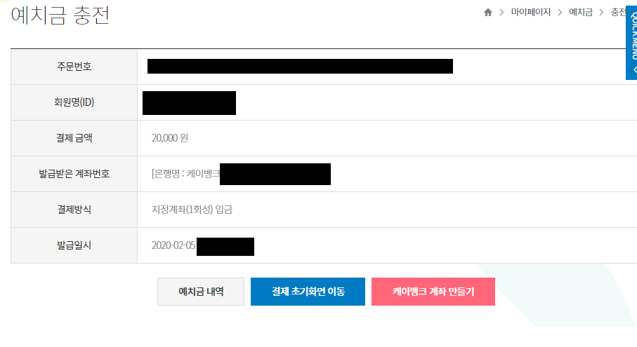 발급받은 계좌번호에 있는 가상계좌번호로 결제금액 송금한 후 새로고침하거나 초기화면으로 이동하면