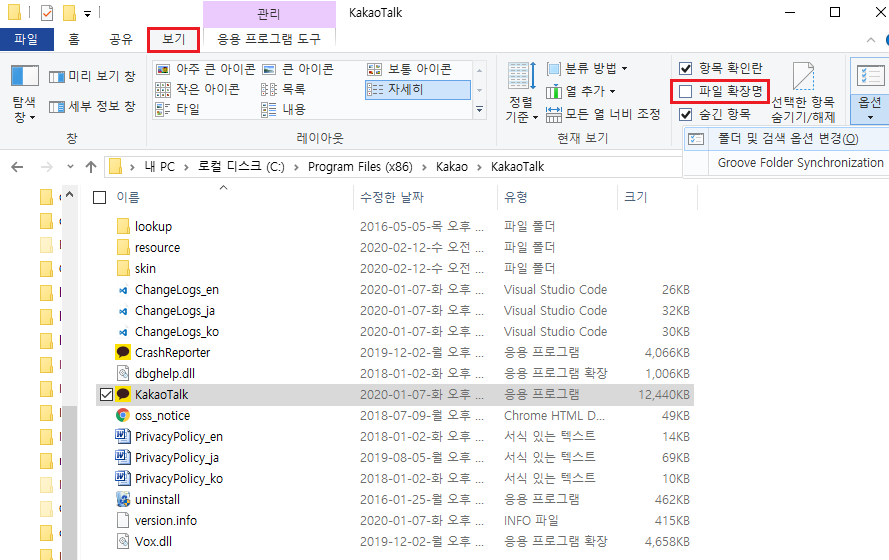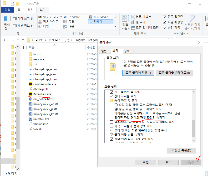 [알려진 파일 형식의 파일 확장명 숨기기]가 있다.