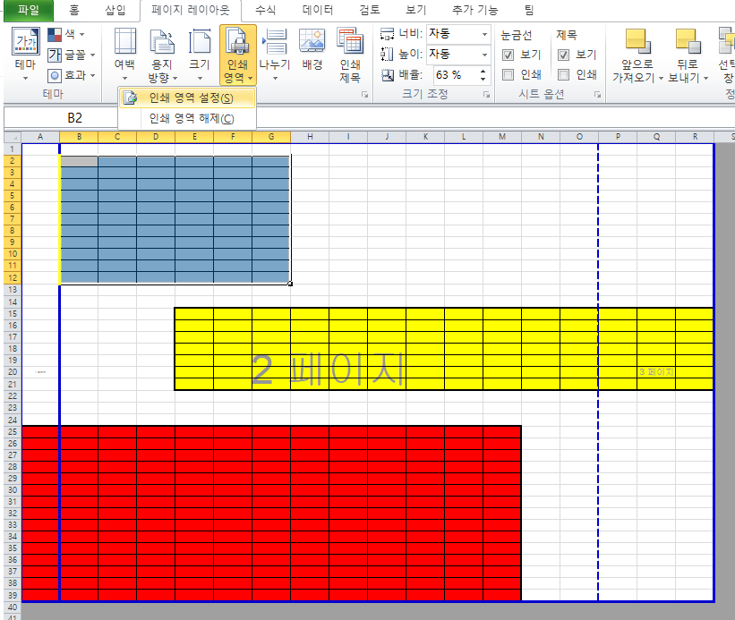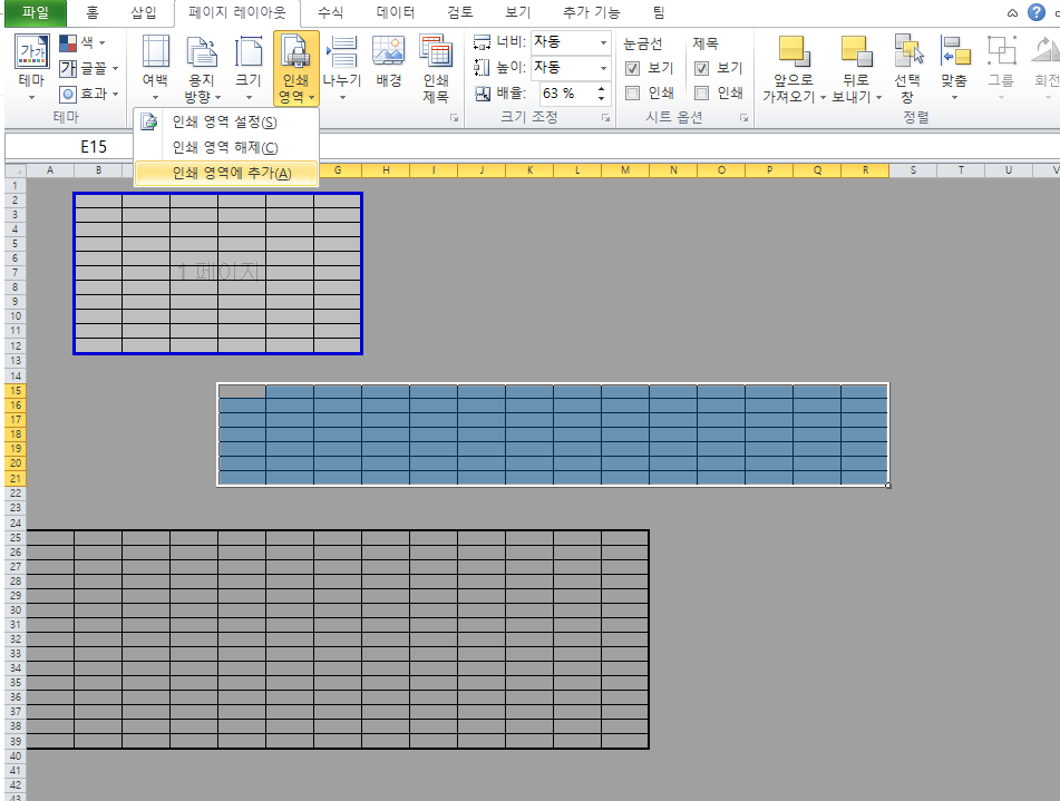 상단탭에서 [인쇄영역] -> [인쇄영역설정]을 눌러준다.