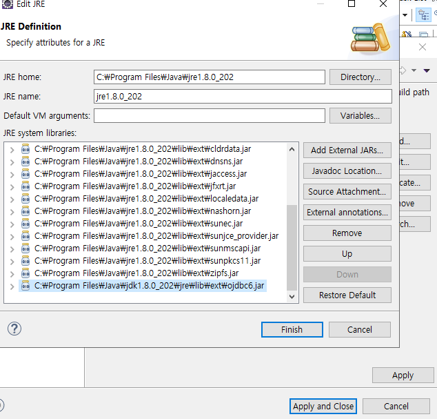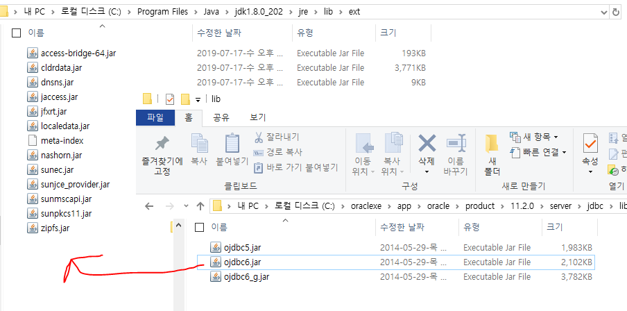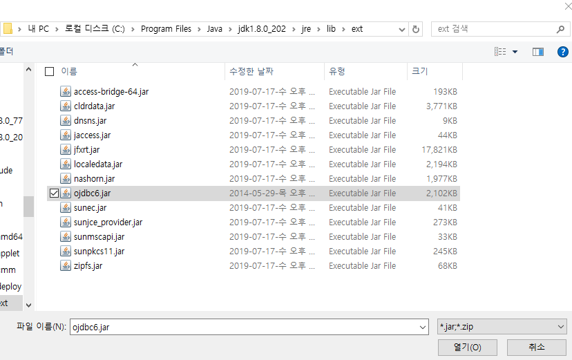이 ojdbc 파일을 java가 설치되어있는 경로에 넣어준다.