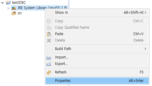 그러면 Package Explorer의 해당프로젝트 JRE System Library에 정상적으로 ojdbc6.jar가 추가된 것이 보인다.